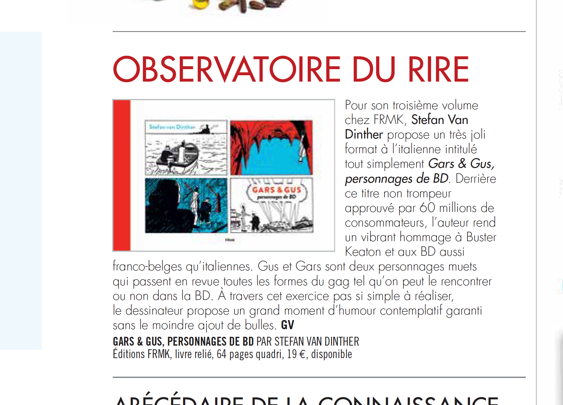DBD : Gus et Gars sont deux personnages muets qui passent en revue toutes les formes du gag tel qu'on peut le rencontrer ou non dans la BD. A travers cet exercice pas si simple á rèaliser, le dessinateur propose un grand moment d'humour contemplatif garanti sans le moindre ajout de bulles.